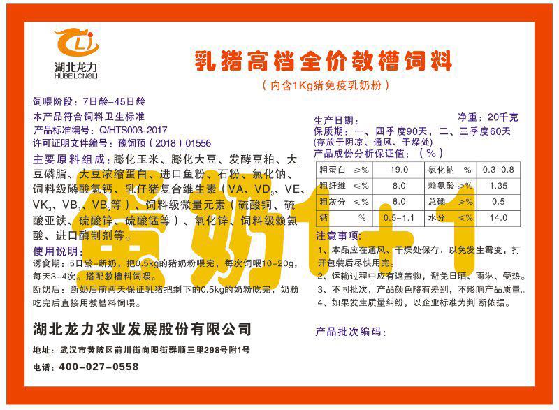 湖北龍力農(nóng)業(yè)發(fā)展股份有限公司坐落于武漢市黃陂區(qū)前川街向陽街群順三里298號(hào)附1號(hào)。公司成立于2014年6月,公司自成立以來把“創(chuàng)全球最大養(yǎng)豬綜合服務(wù)”為企業(yè)愿景。致力于打造教保料品牌”作為公司發(fā)展的明確目標(biāo)。公司一直致力于豬營養(yǎng)的研究和開發(fā),積極與國內(nèi)外高校和科研機(jī)構(gòu)合作,推廣養(yǎng)豬技術(shù)、動(dòng)物營養(yǎng)新概念,向世界農(nóng)牧企業(yè)學(xué)習(xí)與合作。公司采用國內(nèi)先進(jìn)的生產(chǎn)工藝,選擇高精度電子配料秤,高均勻度、無殘留混合機(jī)等先進(jìn)設(shè)備....